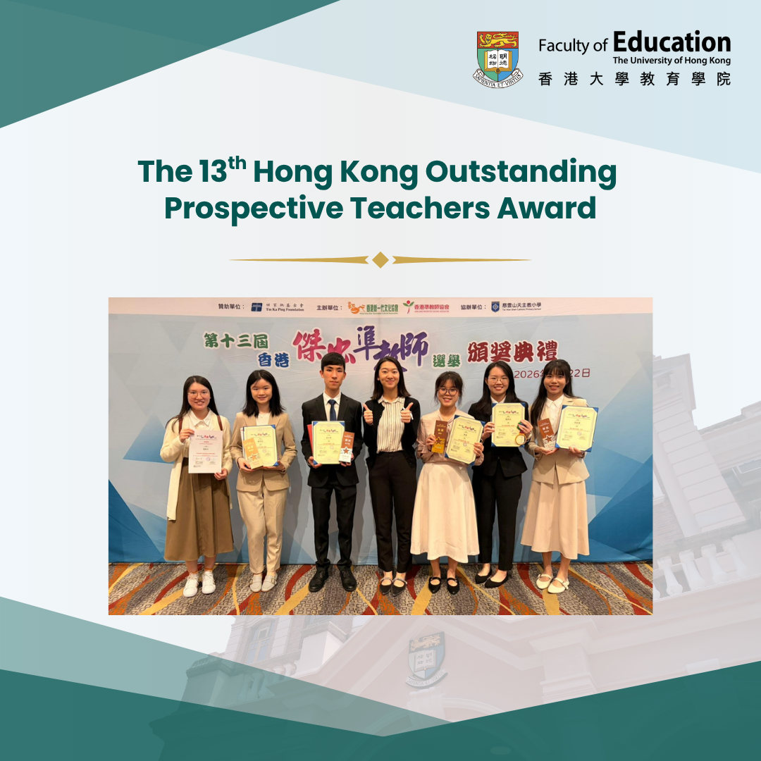 The Faculty of Education is delighted to share that seven students from the Faculty were recognised in The 13th Hong Kong Outstanding Prospective Teachers Award, organised by the Hong Kong New Generation Cultural Association and the Hong Kong Prospective Teachers Association. The award presentation ceremony was held on March 22, 2026 to celebrate excellence in teaching among aspiring educators.